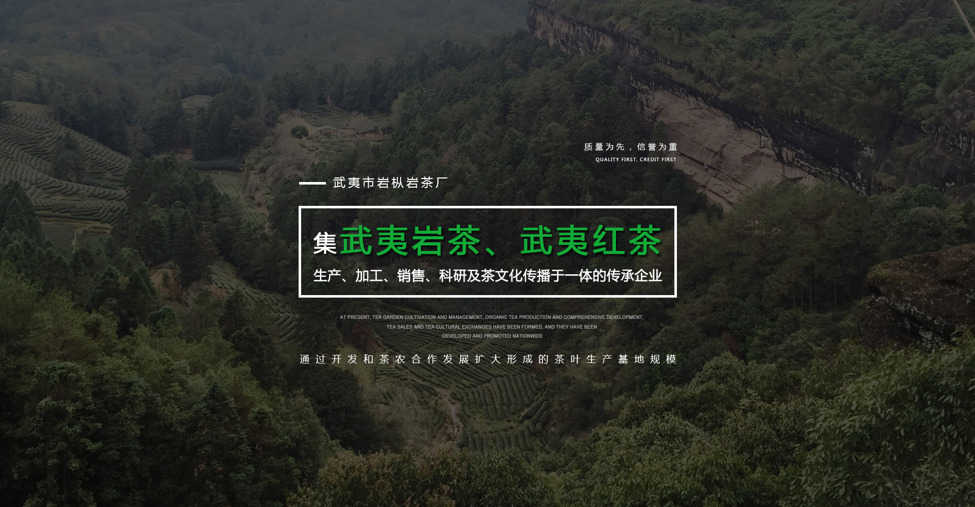 武夷市岩枞岩茶厂成立于2014年12月,是集武夷岩茶、武夷红茶生产、加工、销售、科研及茶文化传 播于一体的传承企业。公司拥有百余年历史的武夷山正岩百年老枞基地及生产队的老基地茶园百亩 ;并通过开发和茶农合作发展扩大形成的茶叶生产基地规模。目前已形成茶园栽培与管理、有机茶叶